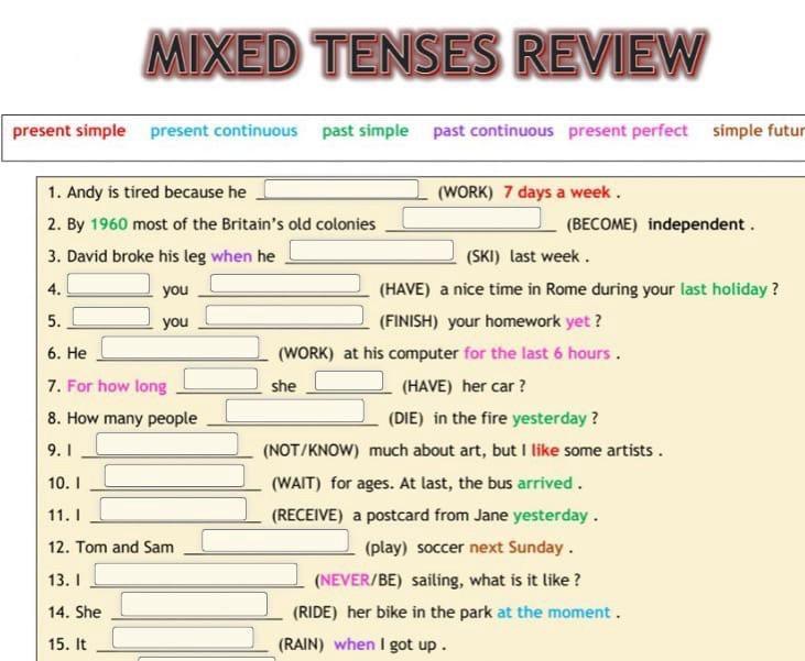 Предложение переписывать не обязательно, мне нужны только ответы в пропусках и рядом с ответом нужно обязательно написать и каком времени это написано ( present simple, present perfect, past simple, past continions, peesent perfect, simple future)