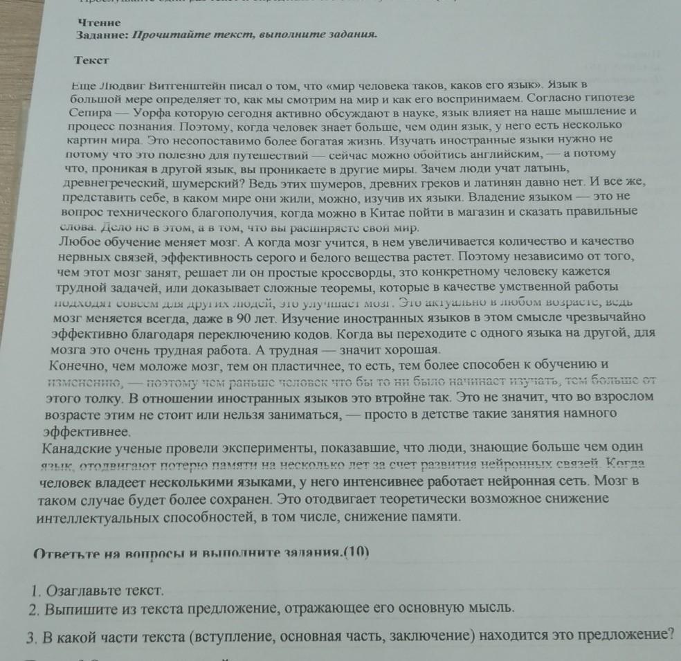 Помогите Ответьте на вопросы и выполните задания тия.(10) 1. Озаглавьте текст. 2. Выпишите из текста предложение, отражающее его основную мысль. 3. В какой части текста (вступление, основная часть, заключение) находится это предложение? Почему? Ответ аргументируйте..