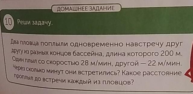 ДОМАШНЕЕ ЗАДАНИЕ 10 Реши задачу. Два пловца поплыли одновременно навстречу друг другу из разных концов бассейна, длина которого 200 м. Один плыл со скоростью 28 м/мин, другой — 22 м/мин. через сколько минут они встретились? Какое расстояние проплыл До встречи каждый из Пловцов? УСЛОВИЯ