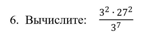 \frac{3^{2} \times 27^{2} }{3^{7} }  =  \frac{3 \times 729}{2187}  =  \frac{729}{729}  = 1