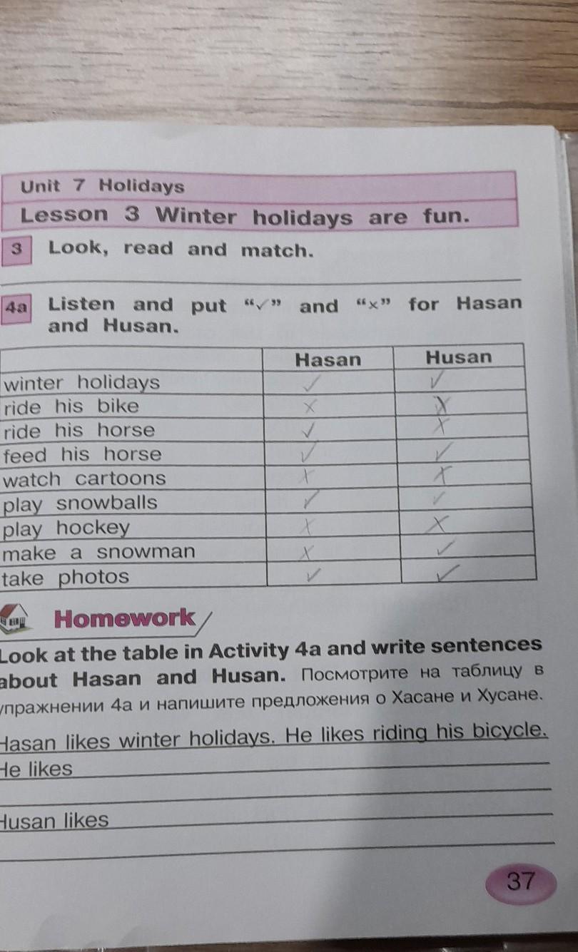 Homework Look at the table in Activity 4a and write sentences about Hasan and Husan. Посмотрите на таблицу в упражнении 4а и напишите предложения о Хасане и Хусане. Hasan likes winter holidays. He likes riding his bicycle. He likes Husan likes.