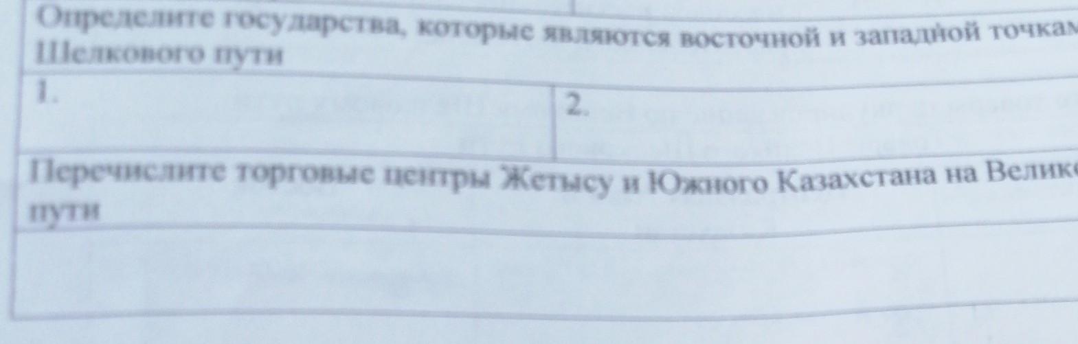 СРОЧНО Определите государства, которые являются восточной и западной точками Великого Шелкового пути 1. 2. Перечислите торговые центры Жетысу и Южного Казахстана на Великом Шелковом Пути