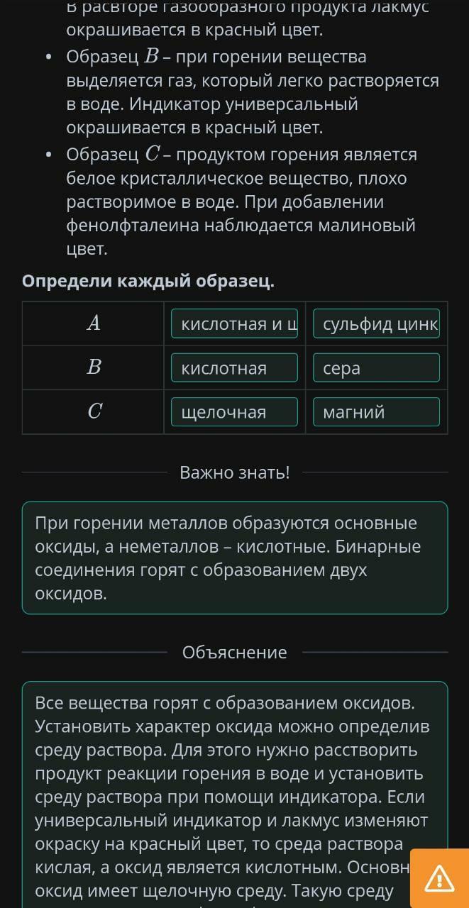 лаборатории было проведено исследование на горючесть магния, серы и сульфида цинка. Для этого был сожжен образец каждого вещества, продукты реакции растворены в воде. Образец A – выделяется два продукта: твердый и газообразный. Твердое вещество при растворении в воде изменяет цвет индикатора фенолфталеина на малиновый. В расвторе газообразного продукта лакмус окрашивается в красный цвет. Образец B – при горении вещества выделяется газ, который легко растворяется в воде. Индикатор универсальный окрашивается в красный цвет. Образец C – продуктом горения является белое кристаллическое вещество, плохо растворимое в воде. При добавлении фенолфталеина наблюдается малиновый цвет. Определи каждый образец.