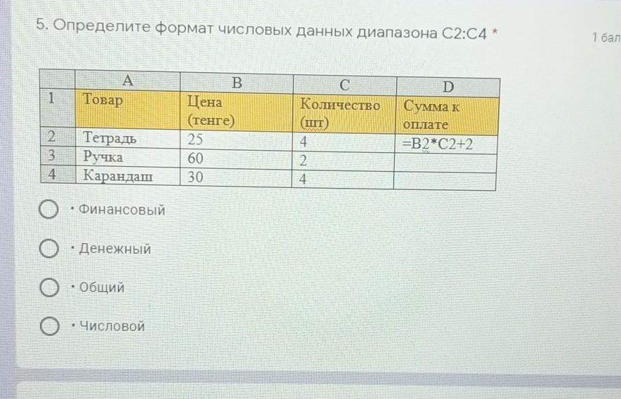 * 5. Определите формат числовых данных диапазона С2:C4 * 1 балл A Товар D Сумма к 1 1 B Цена (тенге) 25 оплате C Количество (шт) 4. 2 4. | | =B2%C2+2 2 3 4 Тетрадь Ручка Карандаш 60 30 Финансовый • Денежный C• Общий Числовой
