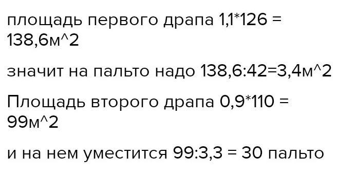 Дам 15 баллов)Из драпа шириной 1,1 м и длиной 126 метра можно сшить 42 одинаковых пальто.Сколько таких пальто можно сшить из драпа шириной 0,9 метра и длиной 110 метра?
