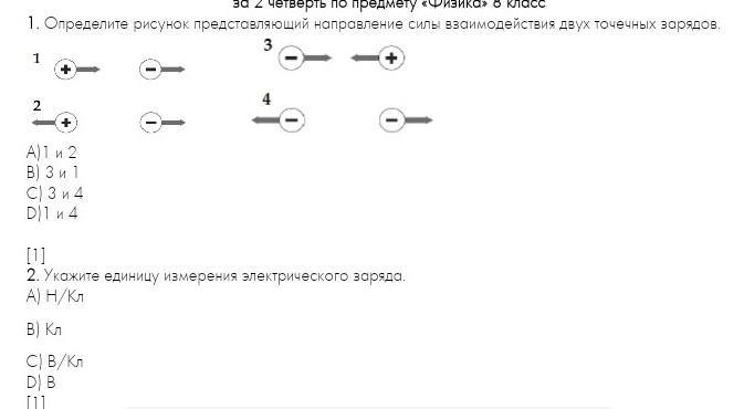 Определите рисунок представляющий направление силы взаимодействия двух точечных зарядов. A)1 и 2 B) 3 и 1 C) 3 и 4 D)1 и 4