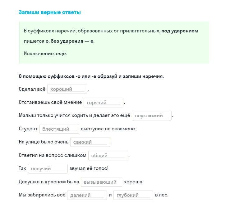 Хорошо, горячо, неуклюже, блестяще, свежо, общо, певуче, вызывающе, дальше, глубже.
