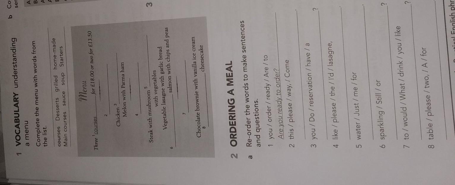 2) Come this way , please. 3) Do you have a reservation? 4) I'd like the lasagne,please. 5) Just water for me. 6) Still or sparkling? 7) What would you like to drink? 8) A table for two, please