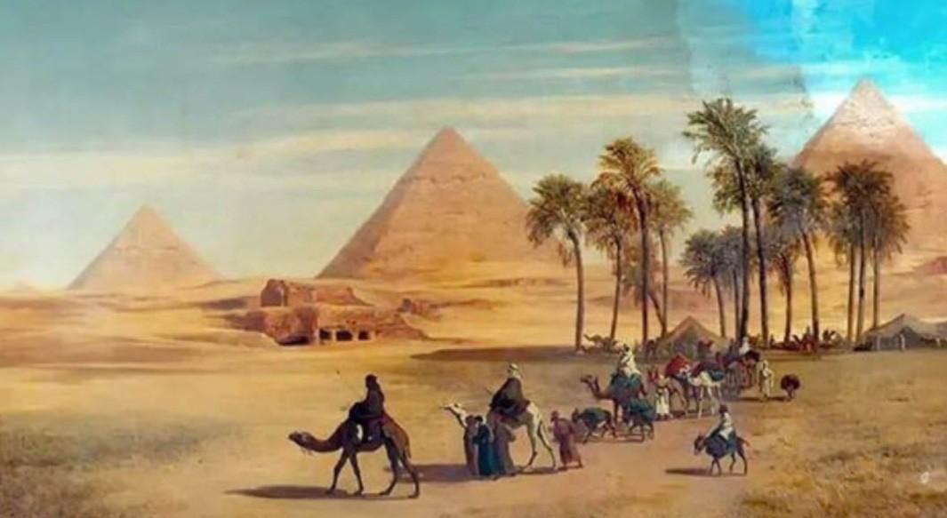 На заднем фоне виднеются три пирамиды и пещера. Пальмы развесив роскошные листья прекрывают от жаркого солнца оставленные людьми из каравана шалаши.