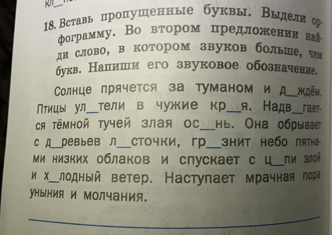 Ответ:Солнце прячется за туманом и дождём. Птицы улетели в чужие края. Надвигается тёмной тучей злая осень. Она обрывает с деревьев листочки, грозит небо пятнами низких облаков и опускает с цепи злой и холодный ветер. наступает мрачная пора уныния и молчания