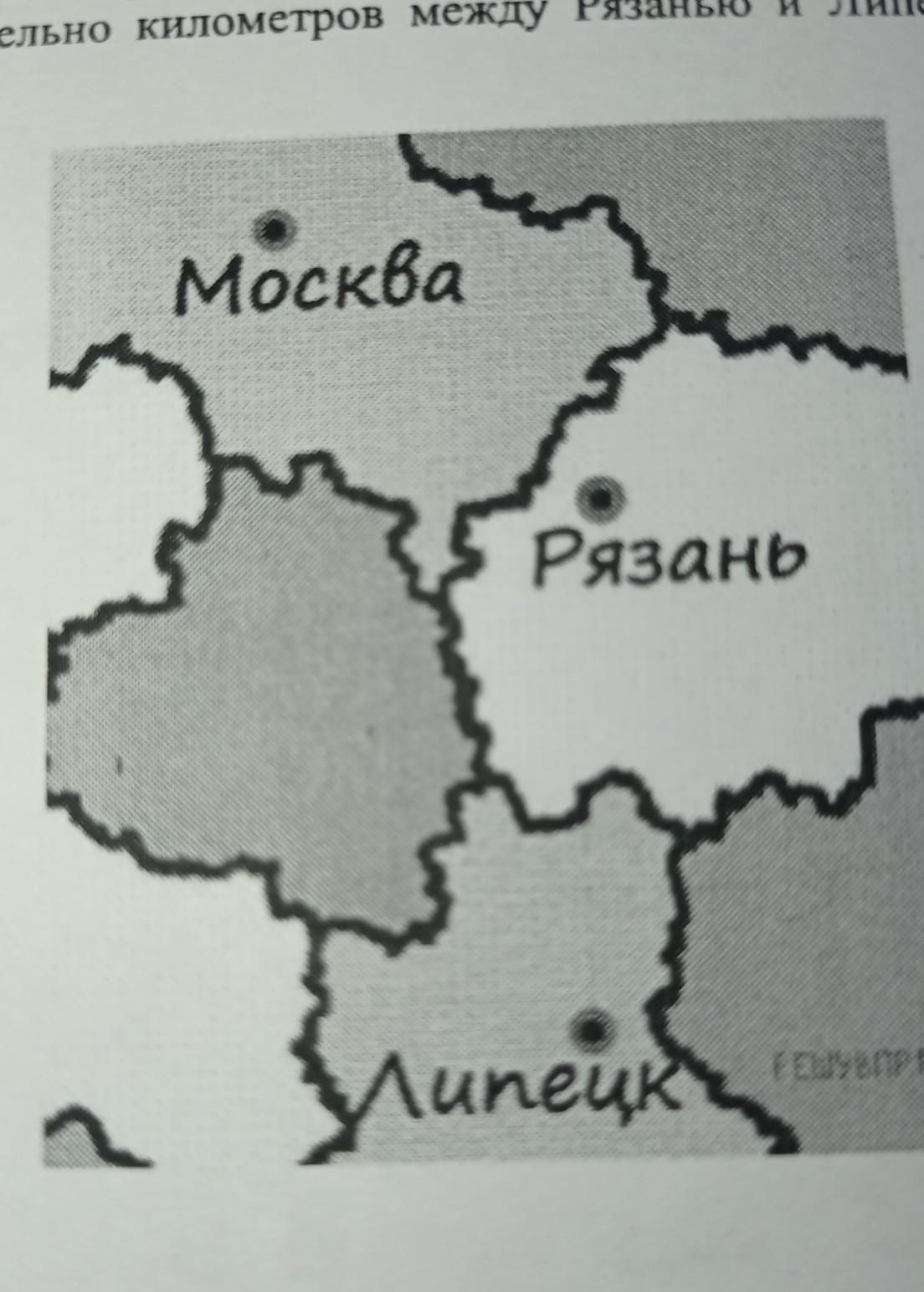 На рисунке изображён фрагмент карты европейской части России. Расстояние между Москвой и Рязанью 190 км. Сколько приблизительно километров между Рязанью и Липецком? В ответ запишите число кратное 10.