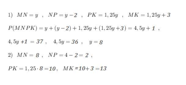 В четырехугольнике MNPK сторона MN = y см 1) Выразите остольные стороны этого четырехугольника, если а) NP на 2 см меньше MN б) PK в 1,25 раз больше MN с) MK на 3 см больше PK 2) зная что периметр MNPK равен 37 см и используя данные пункта 1, составьте уравнение. 3) Решите уравнение полученное в пункте 2. Найдите длину MN