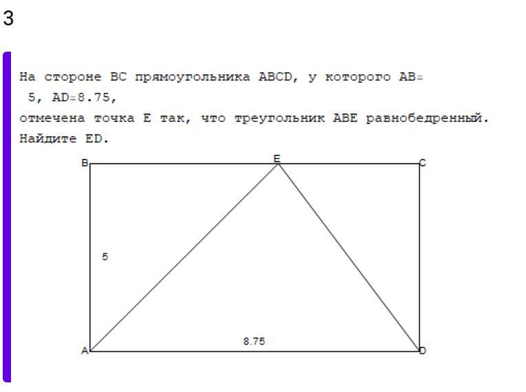 На стороне BC прямоугольника ABCD, у которого AB=5, AD=8,75. Отмечена точка Е так, что треугольник ABE равнобедренный. Найдите ED.