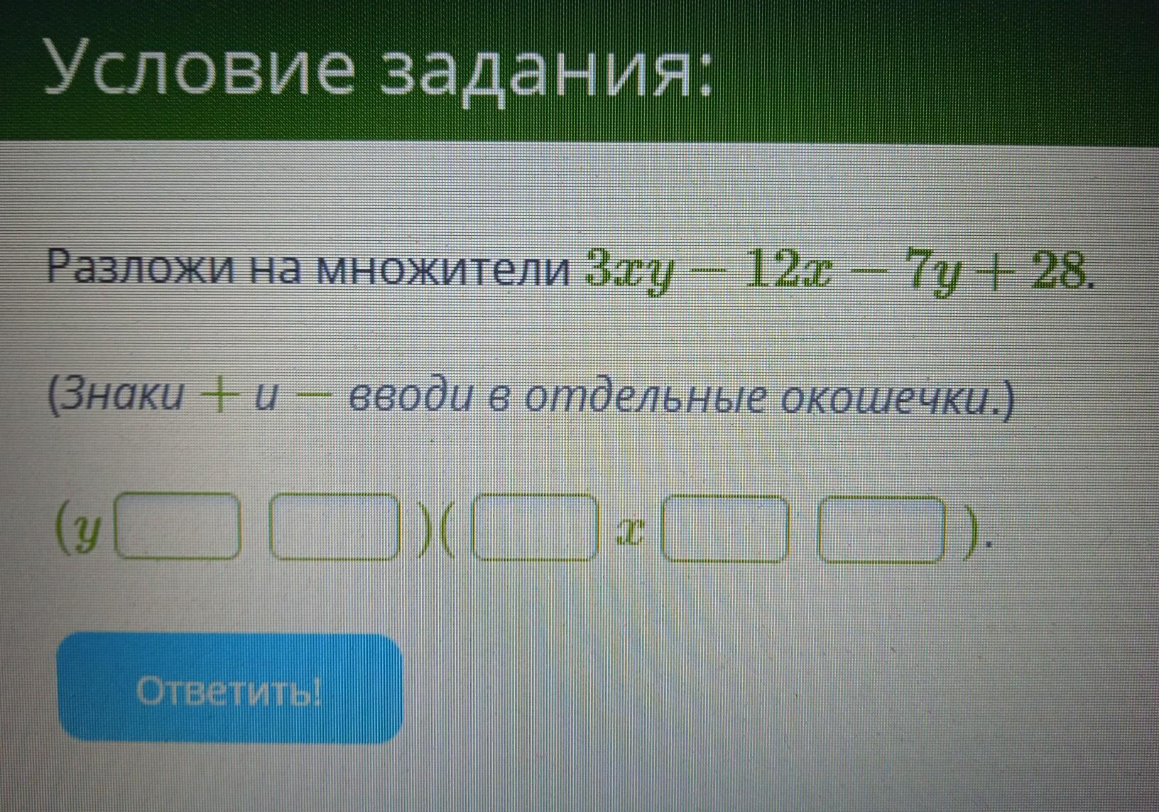 Ответ: Давай разложим на множители два выражения : 3ху и -12х и другие два выражения : -7у и 28. Раскладываем первые два выражения :