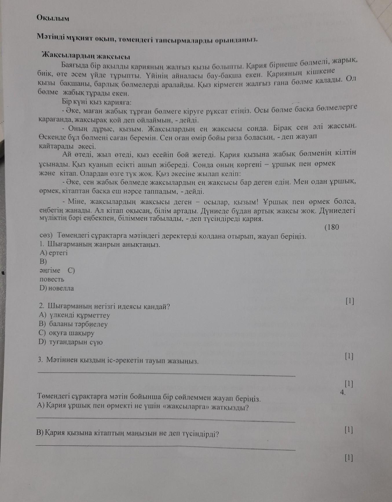 Төмендегі сұрақтарға мәтіндегі деректерді қолдана отырып, жауап беріңіз. 1. Шығарманың жанрын анықтаңыз. A) ертегі B) әңгіме C) Повесть D) новелла 2. Шығарманың негізгі идеясы қандай? А) үлкенді құрметтеу В) баланы тәрбиелеу C) оқуға шақыру D) туғандарын сүю 3. Мәтіннен қыздың іс-әрекетін тауып жазыңыз. Төмендегі сұрақтарға мәтін бойынша бір сөйлеммен жауап беріңіз. А) Қария ұршық пен өрмекті не үшін «жақсыларга» жатқызды? В) Қария қызына кітаптың маңызын не деп түсіндірді?