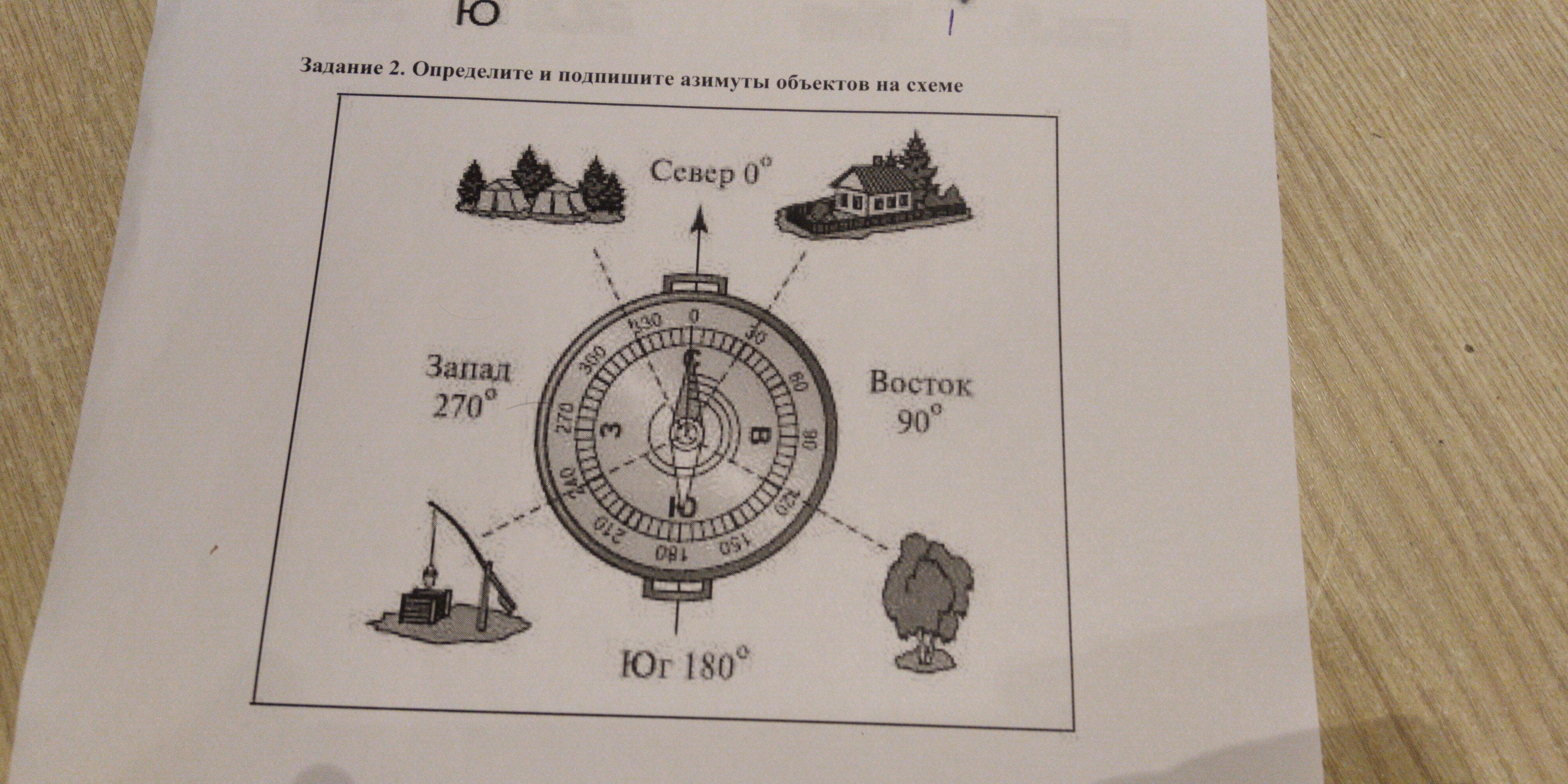 Ответ: азимут дома 30° азимут дерева 120° азимут колодца 230° азимут палаток 320°