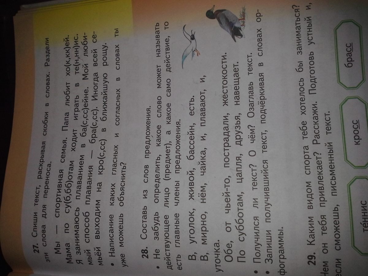 В живом уголке есть бассейн.(главные члены:бассейн, есть) В нем мирно плавают и чайка и уточка.(главные члены: чайка, уточка, плавают) Обе пострадали от чьей-то жестокости.(главные члены: пострадали, обе) По субботам цапля навещает друзей. (главные члены: цапля навещает)