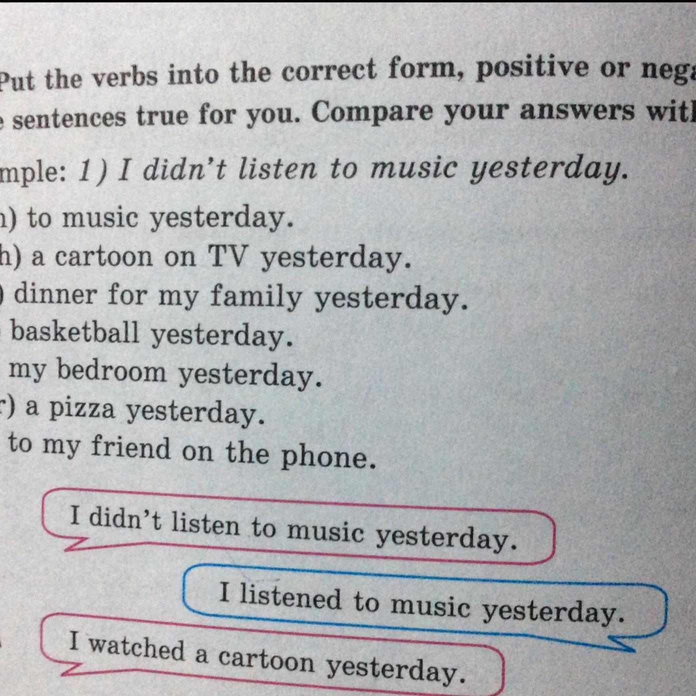 нужно составить диалог как показано в примере например : Я не слушал музыку вчера, я слушал музыку вчера, я смотрела мультики вчера ,я не смотрела мультики вчера и т . д