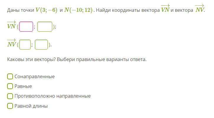 1. Даны точки V(3;−6) и N(−10;12) . Найди координаты вектора VN−→ и вектора NV−→.
