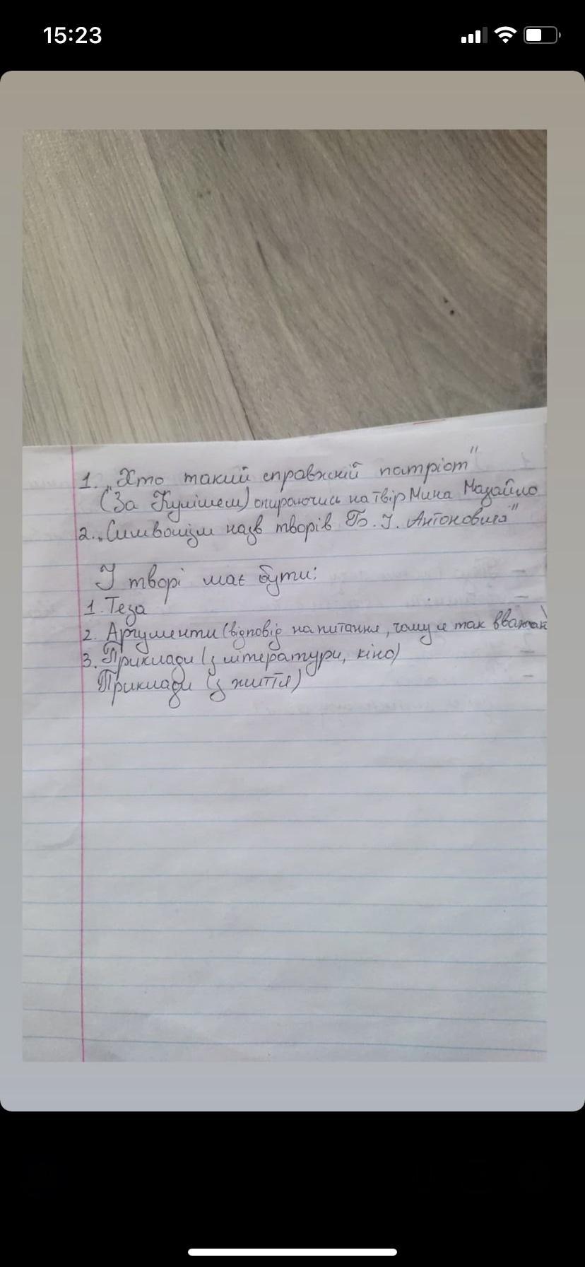 На мою думку, патріот — це людина, віддана своєму народові, яка любить свою Батьківщину, готова її захищати в найважчі хвилини, людина, що живе і працює заради процвітання свого краю. Інколи, і навіть сьогодні, з високих трибун звучить море слів про любов і відданість Україні, але, на жаль, це тільки слова. Проте можна навести безліч прикладів самовідданої любові українців до рідного краю. Сьогодення є прикладом цього, адже багато синів і дочок України віддали за неї найдорожче — життя. Ми стали свідками цього. Події Майдану, війна на Сході… І досі проливається кров найщиріших патріотів. Історія свідчить, що українці в усі часи були патріотами. Про це розповідають історичні пісні й думи, художня література. Прикладом самовідданого служіння рідній землі є, наприклад, Ярослав Мудрий, справжні патріоти Залізняк, Гонта, Кривоніс, Дорошенко, Богдан Хмельницький, Леся Українка, Тарас Шевченко, Михайло Грушевський, Василь Стус, Іван Пулюй, наша сучасниця Ліна Костенко. Порушує тему патріотизму та засуджує балакунів-псевдопатріотів В. Самійленко в поезії «Патріоти». Справжнім патріотом у цій поезії, на мою думку, є третій юнак, який …бачив душею Вкраїну І все, що вона добула. Письменник намагається допомогти читачам не купитись на гарні слова, а дбати про свій край, любити рідну землю, працювати для неї. Я ще зовсім юна. І хоча життєвого досвіду в мене небагато, проте розумію, що дуже легко любити Батьківщину, коли вона багата і могутня, значно важче — коли вона слабка і незахищена. Та хіба зможуть справжні сини кинути хвору матір напризволяще? Я не засуджую тих людей, які в пошуках кращої долі емігрували за кордон, але впевнена, що вони глибоко нещасні, бо, можливо, маючи матеріальні блага, вони не мають змоги дихати рідним повітрям, бачити, як ростуть їхні діти, уклонитися рідній оселі, захищати свою землю від ворогів. Отже, справді, справжніми патріотами є ті люди, які не розказують про любов до рідного краю, а захищають його навіть ціною власного життя, працюють і живуть задля його процвітання, примножуючи набуте.