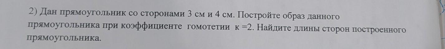 2) Дан прямоугольник со сторонами 3 см и 4 см. Постройте образ данного прямоугольника при коэффициенте гомотетии к=2. Найдите длины сторон построенного прямоугольника.