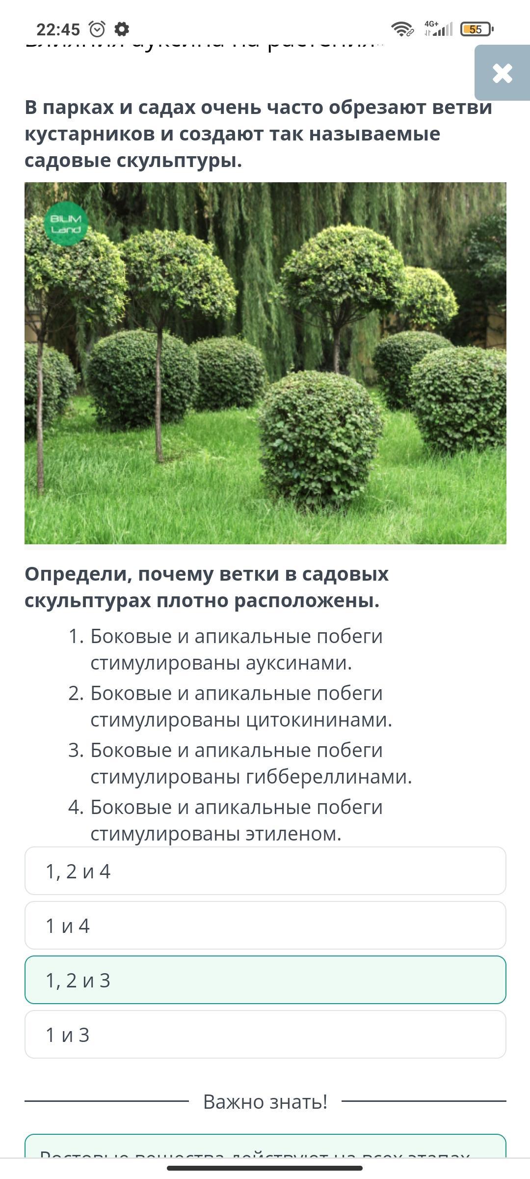 Определи, почему ветки в садовых скульптурах плотно расположены. 1. Боковые и апикальные побеги стимулированы ауксинами. 2. Боковые и апикальные побеги стимулированы цитокининами. 3. Боковые и апикальные побеги стимулированы гиббереллинами. 4. Боковые и апикальные побеги стимулированы этиленом.