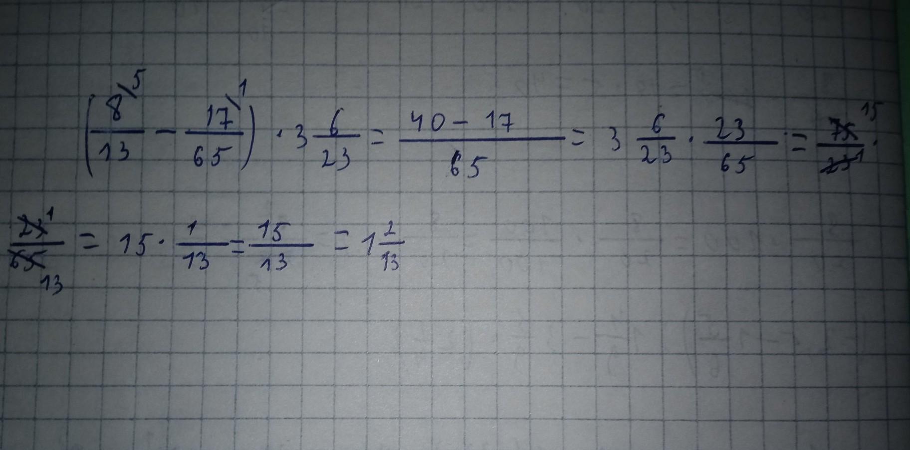 3 6/23 × 23/65 = 1 2/13