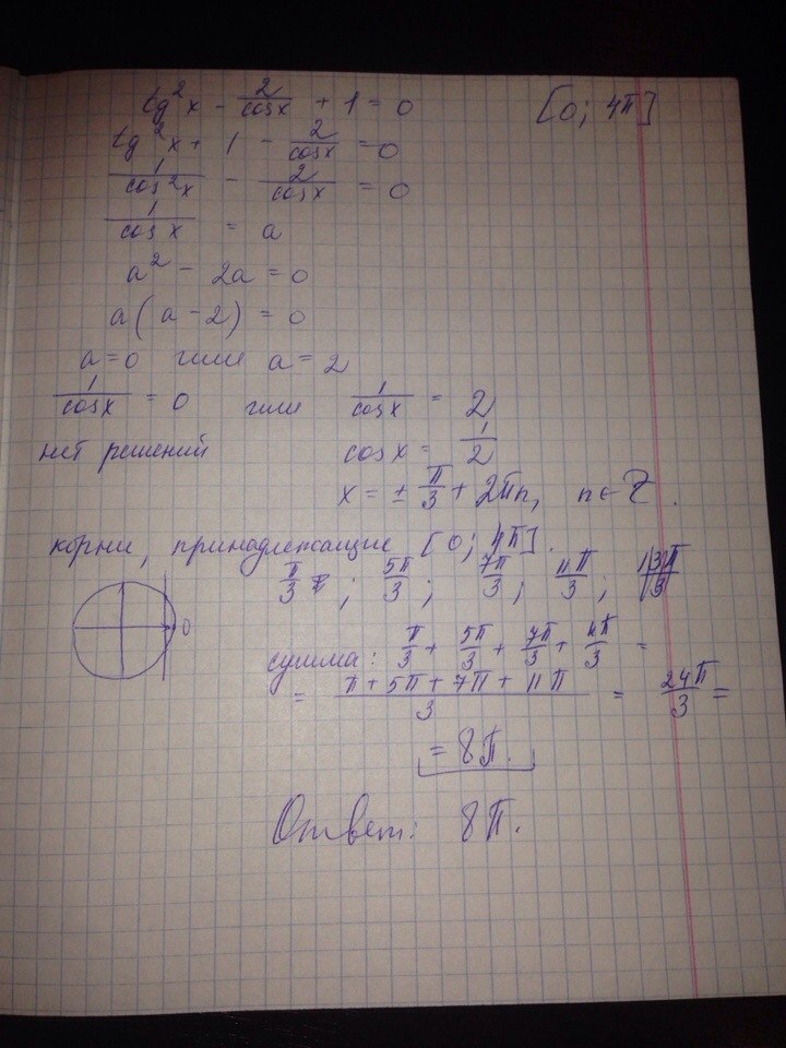 найдите сумму корней уравнения tg^2x - (2/cosx) +1=0 на [0;4pi]