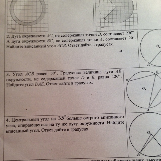Мне непонятно третье условие. Решаю вторую задачу. Дуга Ас=230 градусов. Дуга ВС=20 градусов. Значит дугаАВ=360-230-20=110.( градусная мера окружности 360 градусов). Угол АСД вписанный . Он опирается на дугу АВ. Вписанный угол равен половине дуги на которую опирается, т.е. угол АСВ=1/2 дуги АВ=1/2*110=55 градусов.
