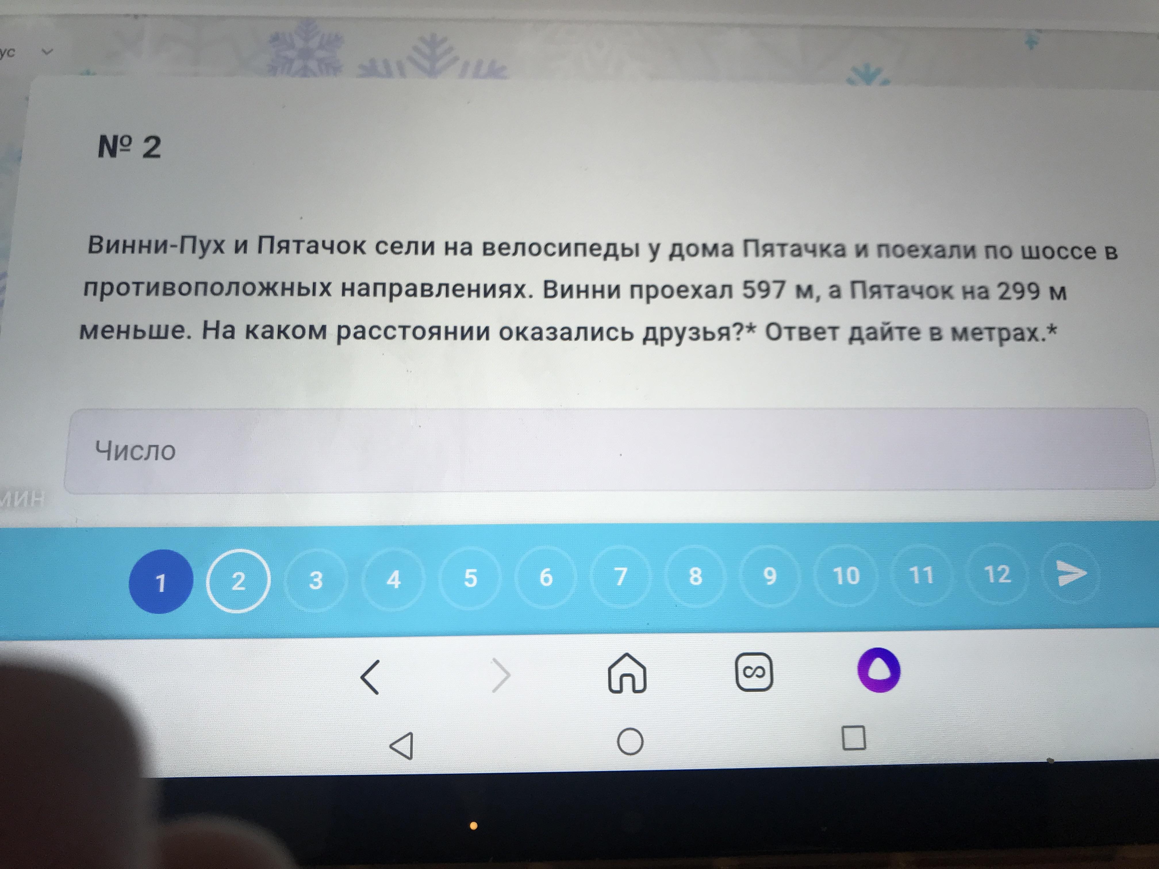 Винни-Пух и пятачок сели на велосипеды у дома пятачка и поехали по шоссе в противоположных направлениях. Винни проехал 597 м, а пятачок на 299 м меньше. На каком расстоянии оказались друзья? (ответ дайте в метрах)