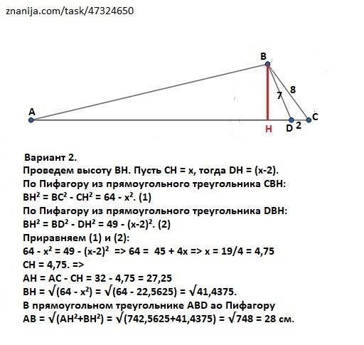 АВ = √(АН²+ВН²) = √(742,5625+41,4375) = √748 = 28см.