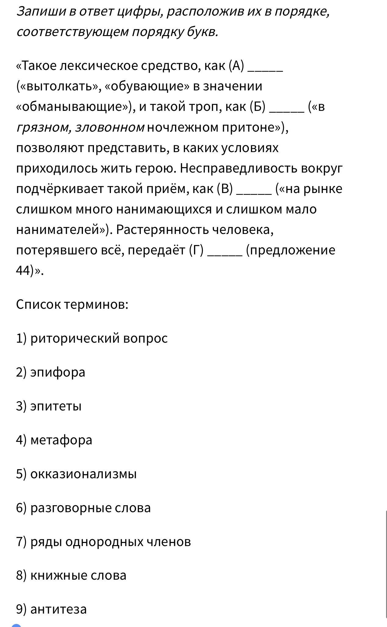 А. метафоры; Б. эпитеты; В. антитеза; Г. риторический вопрос.