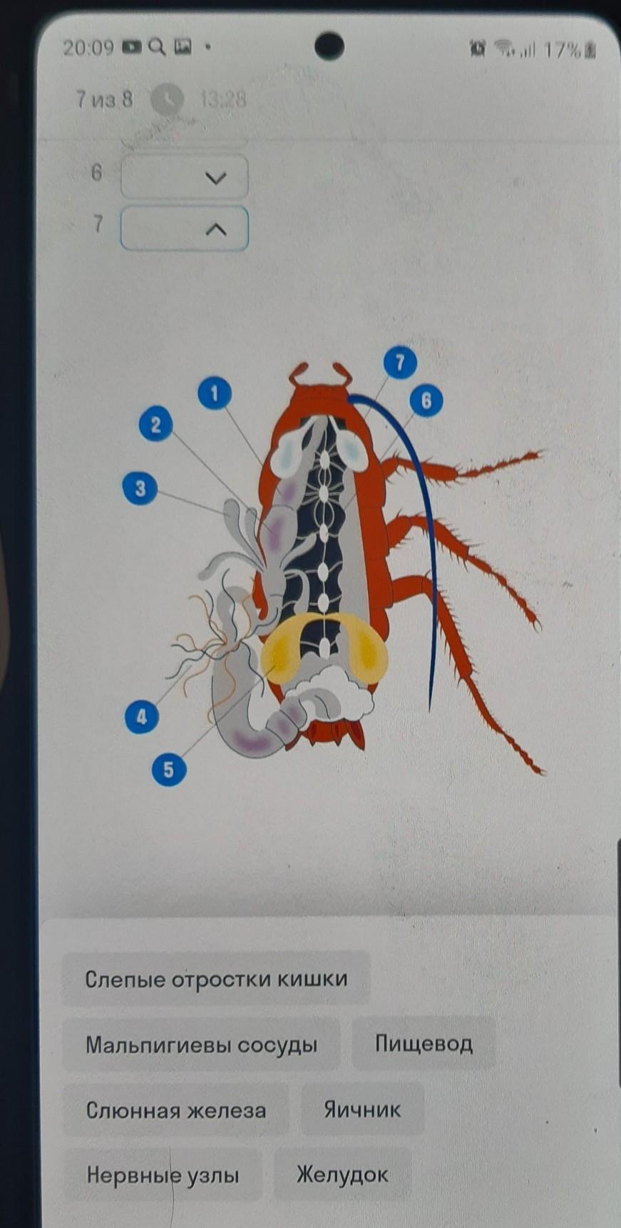 5 яичник 7 слюнная железа 4 нервные узлы 1 желудок 2 пищевод 3 мальпигиевые сосуды 6 незнаю точно вроде правильно