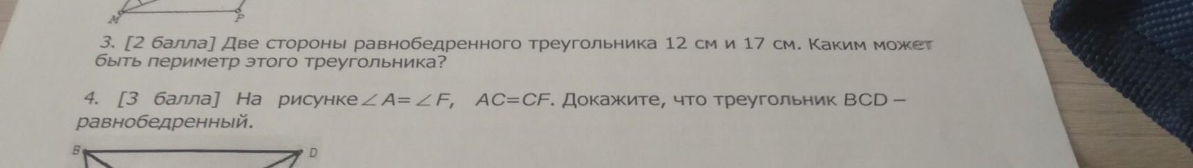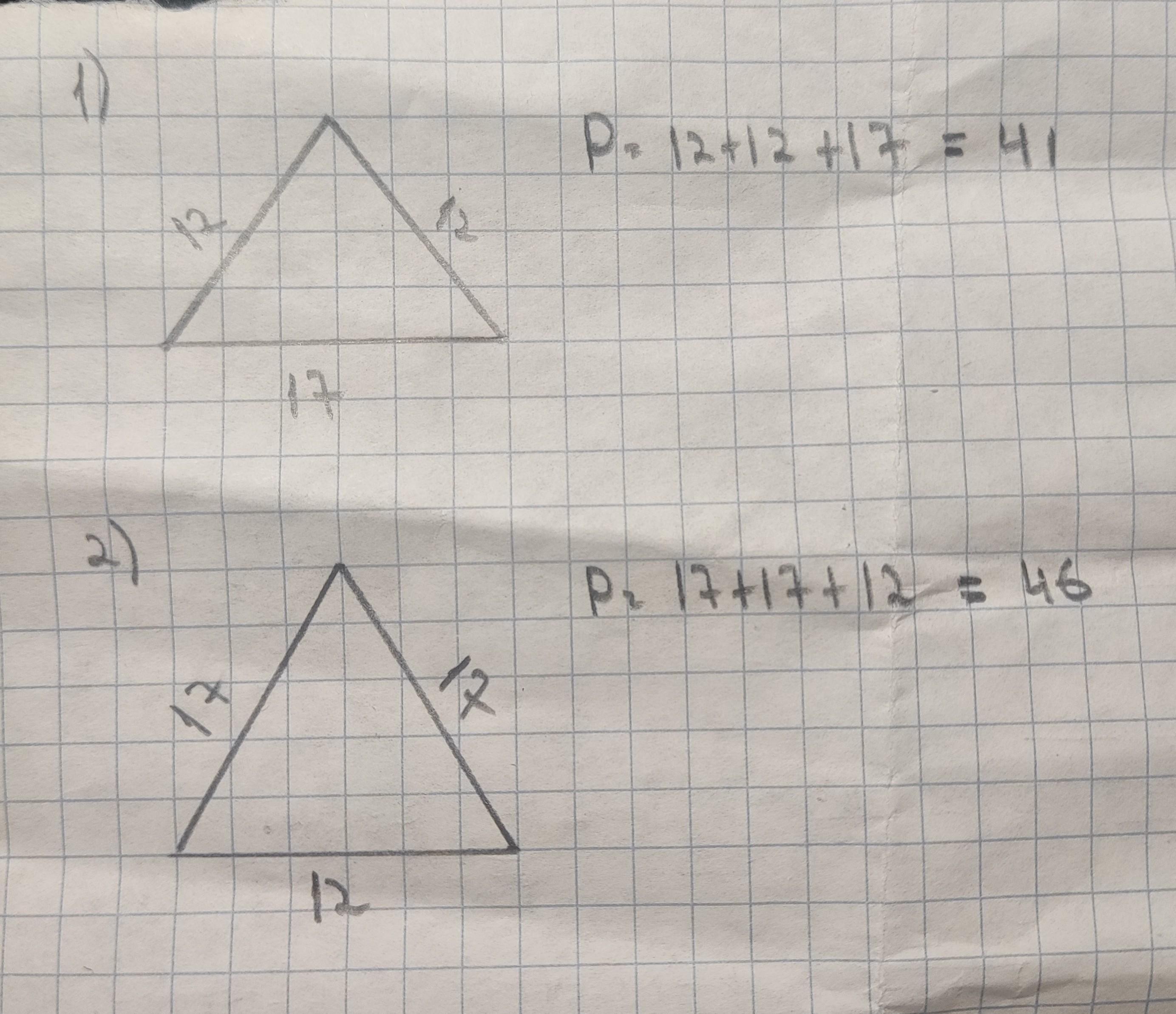 помогите пожалуйста с 3 заданием 2 стороны равнобедренного треугольника 12 см и 17 см каким может быть периметр этого треугольника ? начертите треугольник