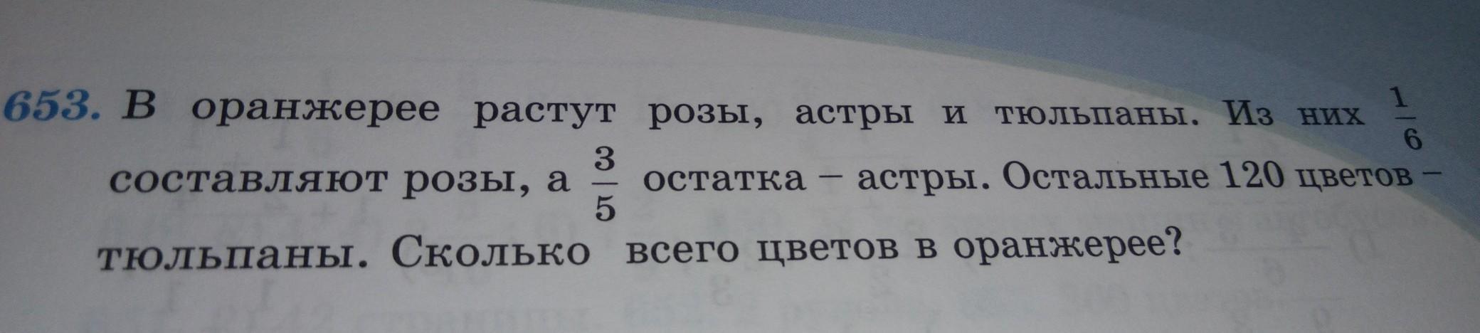 653. В оранжерее растут розы, астры и тюльпаны. Из них 6 3 составляют розы, а остатка - астры. Остальные 120 цветов 5 тюльпаны. Сколько всего цветов в оранжерее?
