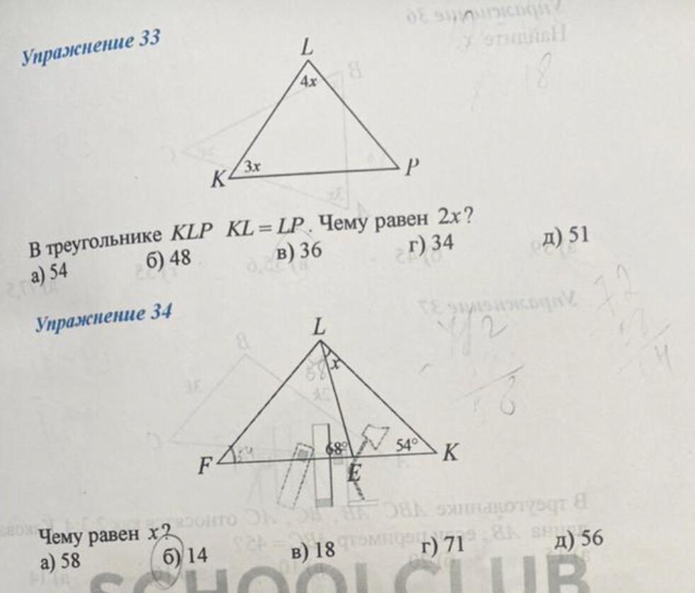 33. Т.к. KL=LP, то треугольник KLP - равнобедренный, следовательно ∠LKP=∠LPK=3x. Сумма углов в треугольнике = 180°, следовательно: