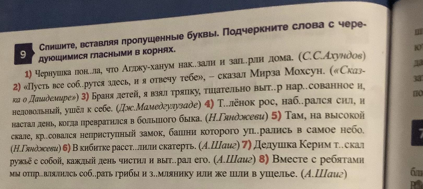 Спишите, вставляя пропущенные буквы. Подчеркните слова с чередующимися гласными в корнях.