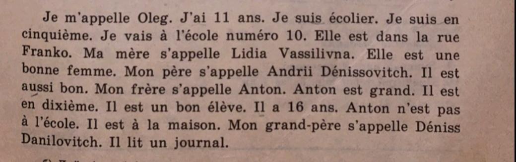 Меня зовут Олег. Мне 11 лет. Я люблю футбол. Мой номер 10. У меня есть друг Франко. Мою маму зовут Лидия Васильевна. Папу зовут Андрей Денисович. Мой друг Антон. Антон умный. Ему 16 лет. Антон имеет машину. Мой умный учитель Денис Данилович любит журналы.
