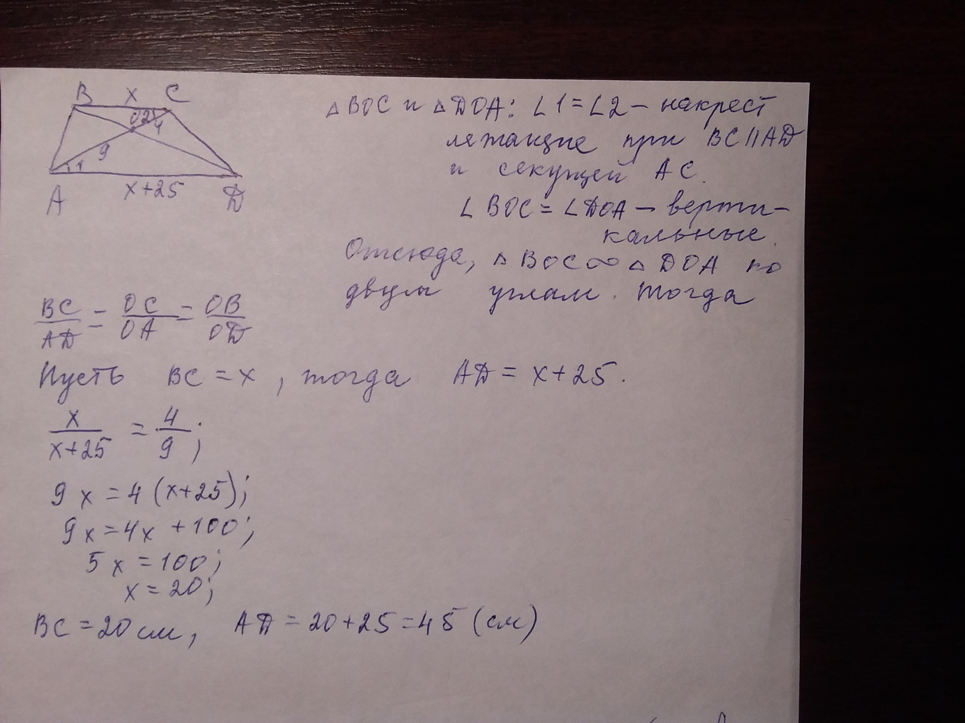 В трапеции ABCD диагонали пересекаются в точке О. Точка пересечения диагоналей трапеции делит диагональ АС на отрезки 9см и 4см. Найдите основания трапеции AD и BC, если их разность ранна 25см. Выполните чертеж по условию задачи