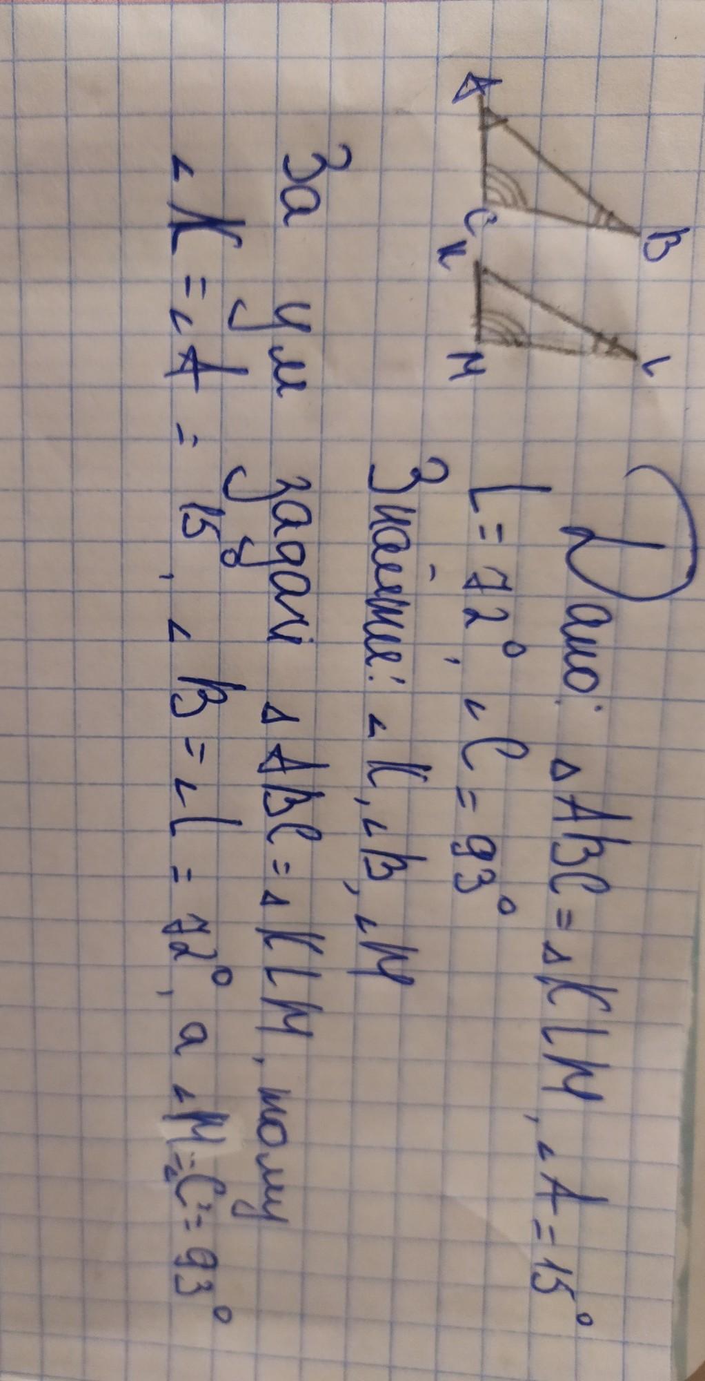 Оскільки ∆ рівні,то кут К=куту А=15°. Кут В=куту L=72°. кут М=куту С=93°