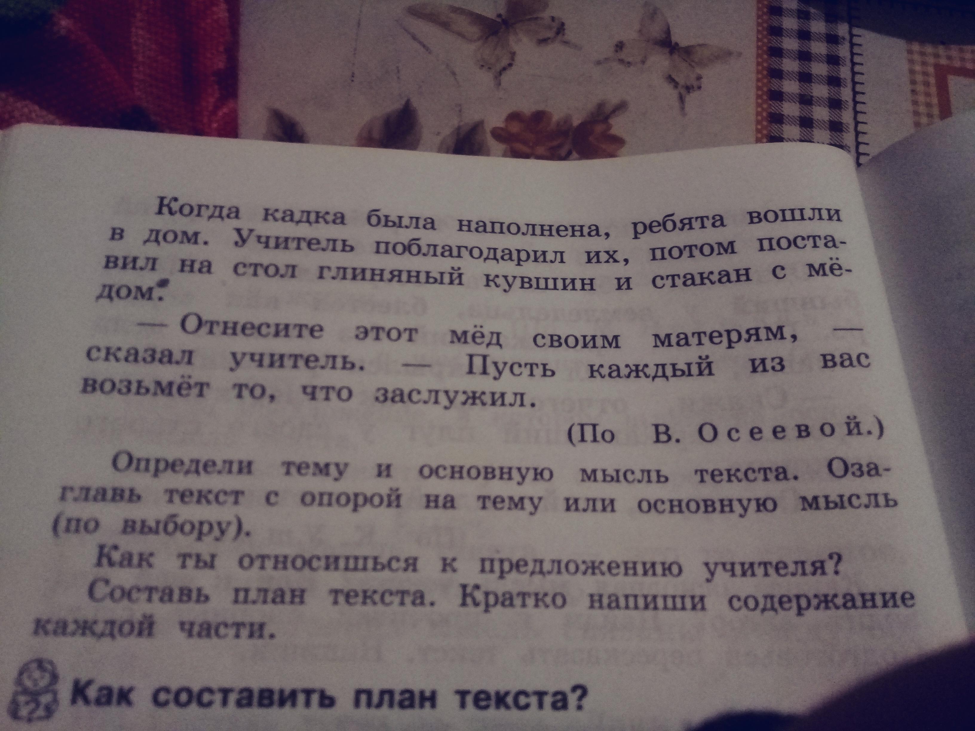 Прочитай. Определи тему и основную мысль текста. Озаглавь текст с опорой на тему или основную мысль (по выбору). Как ты относишься к предложению учителя? Составь план текста. Кратко напиши содержание каждой части.