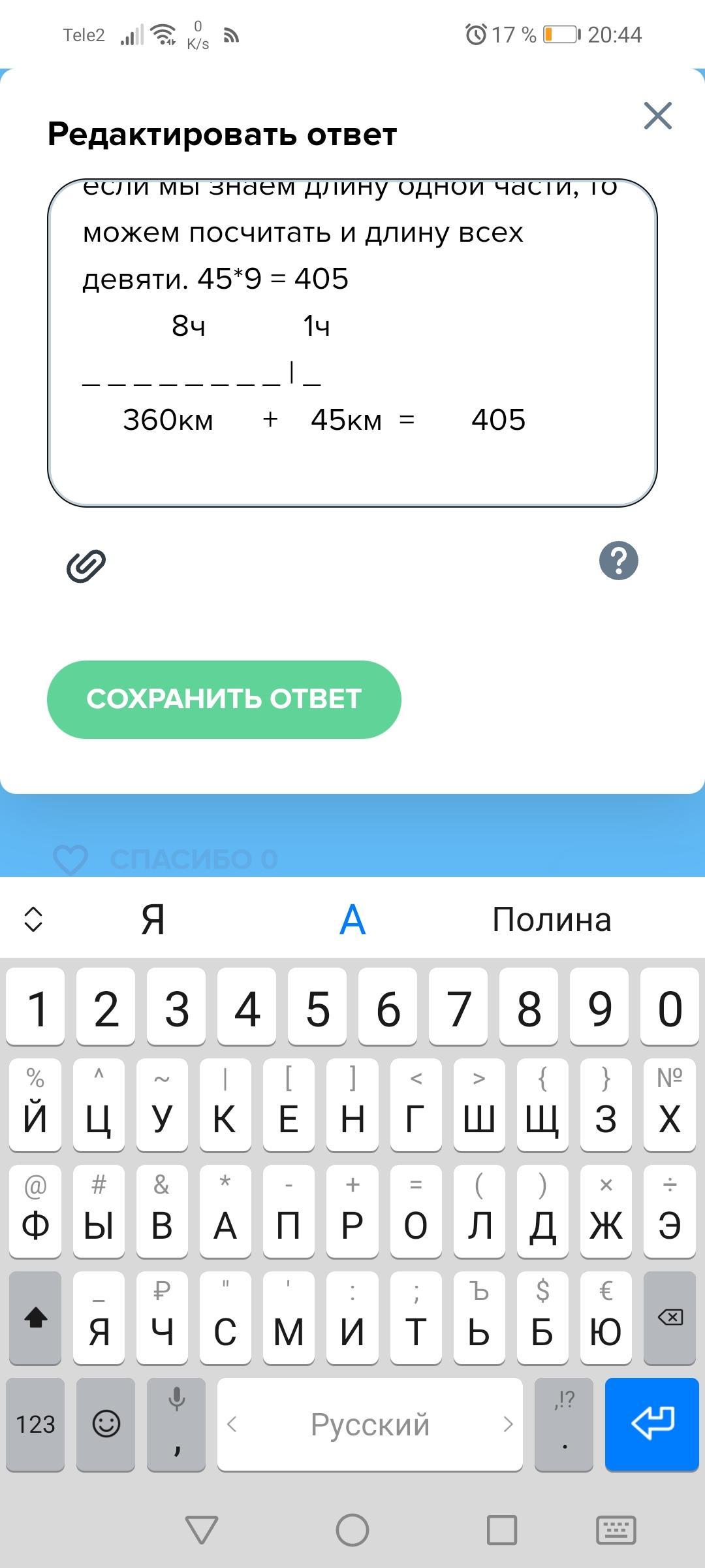 Объяснение: у нас есть 9 частей всего пути. 8 из них составляют 360км. Это значит, что