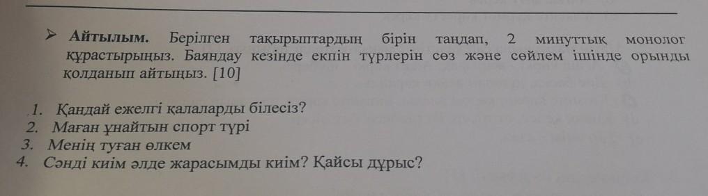 ► Айтылым . Берілген такырыптарын бiрiн тандап , 2 курастырып , basiy keniнде екпін түрлерін с және сойлем liнде орын минуттык монолог колды aff [ 1. Кандай ежелгi апарлы бiлесis ? 2. Маган унайтын спорт тур 3. Менiн туган олкем 4. Сандi киiм алде жарасымды киiм ? Кайсы дұрыс ? пожалуйста у меня через 3 мин соч по каз даю 50 баллов