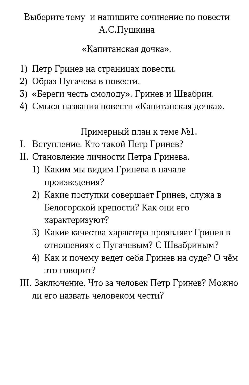 Отец мой Андрей Петрович Гринев в молодости своей служил при графе Минихе и вышел в отставку премьер-майором в 17.. году. С тех пор жил он в своей Симбирской деревне, где и женился на девице Авдотье Васильевне Ю., дочери бедного тамошнего дворянина. Нас было девять человек детей. Все мои братья и сестры умерли во младенчестве.Матушка была еще мною брюхата, как уже я был записан в Семеновский полк сержантом, по милости майора гвардии князя В., близкого нашего родственника. Если бы паче всякого чаяния матушка родила дочь, то батюшка объявил бы куда следовало о смерти неявившегося сержанта, и дело тем бы и кончилось. Я считался в отпуску до окончания наук. В то время воспитывались мы не по-нонешнему. С пятилетнего возраста отдан я был на руки стремянному Савельичу, за трезвое поведение пожалованному мне в дядьки. Под его надзором на двенадцатом году выучился я русской грамоте и мог очень здраво судить о свойствах борзого кобеля. В это время батюшка нанял для меня француза, мосье Бопре, которого выписали из Москвы вместе с годовым запасом вина и прованского масла. Приезд его сильно не понравился Савельичу. «Слава богу, — ворчал он про себя, — кажется, дитя умыт, причесан, накормлен. Куда как нужно тратить лишние деньги и нанимать мусье, как будто и своих людей не стало!»Бопре в отечестве своем был парикмахером, потом в Пруссии солдатом, потом приехал в Россию pour etre outchitel 1, не очень понимая значение этого слова. Он был добрый малый, но ветрен и беспутен до крайности. Главною его слабостию была страсть к прекрасному полу; нередко за свои нежности получал он толчки, от которых охал по целым суткам. К тому же не был он (по его выражению) и врагом бутылки, т. е. (говоря по-русски) любил хлебнуть лишнее. Но как вино подавалось у нас только за обедом, и то по рюмочке, причем учителя обыкновенно и обносили, то мой Бопре очень скоро привык к русской настойке и даже стал предпочитать ее винам своего отечества, как не в пример более полезную для желудка. Мы тотчас поладили, и хотя по контракту обязан он был учить меня по-французски, по-немецки и всем наукам, но он предпочел наскоро выучиться от меня кое-как болтать по-русски, — и потом каждый из нас занимался уже своим делом. Мы жили душа в душу. Другого ментора я и не желал. Но вскоре судьба нас разлучила, и вот по какому случаю:Прачка Палашка, толстая и рябая девка, и кривая коровница Акулька как-то согласились в одно время кинуться матушке в