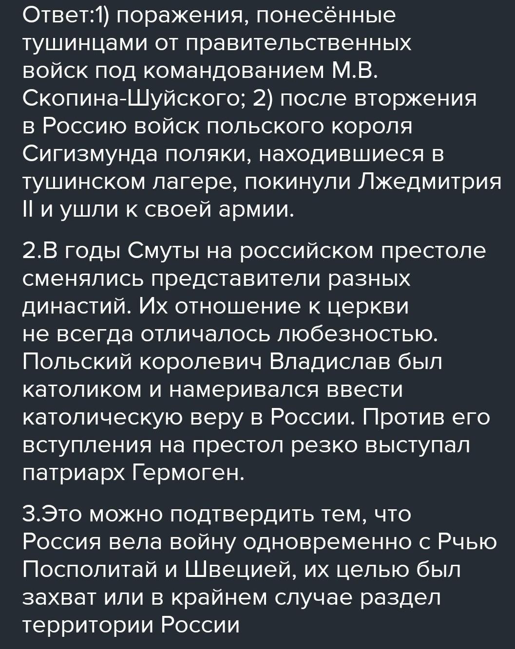 1. Почему распался тушинский лагерь? Закономерен ли, с вашей точки зрения, исход авантюры Лжедмитрия II? 2. Охарактеризуйте позицию патриарха Гермогена в отношении призвания на российский престол польского королевича Владислава. Почему служение патриарха Гермогена называют подвигом? Какова в целом была роль Русской православной церкви в годы Смуты?(ИСТОРИЯ РОССИИ )