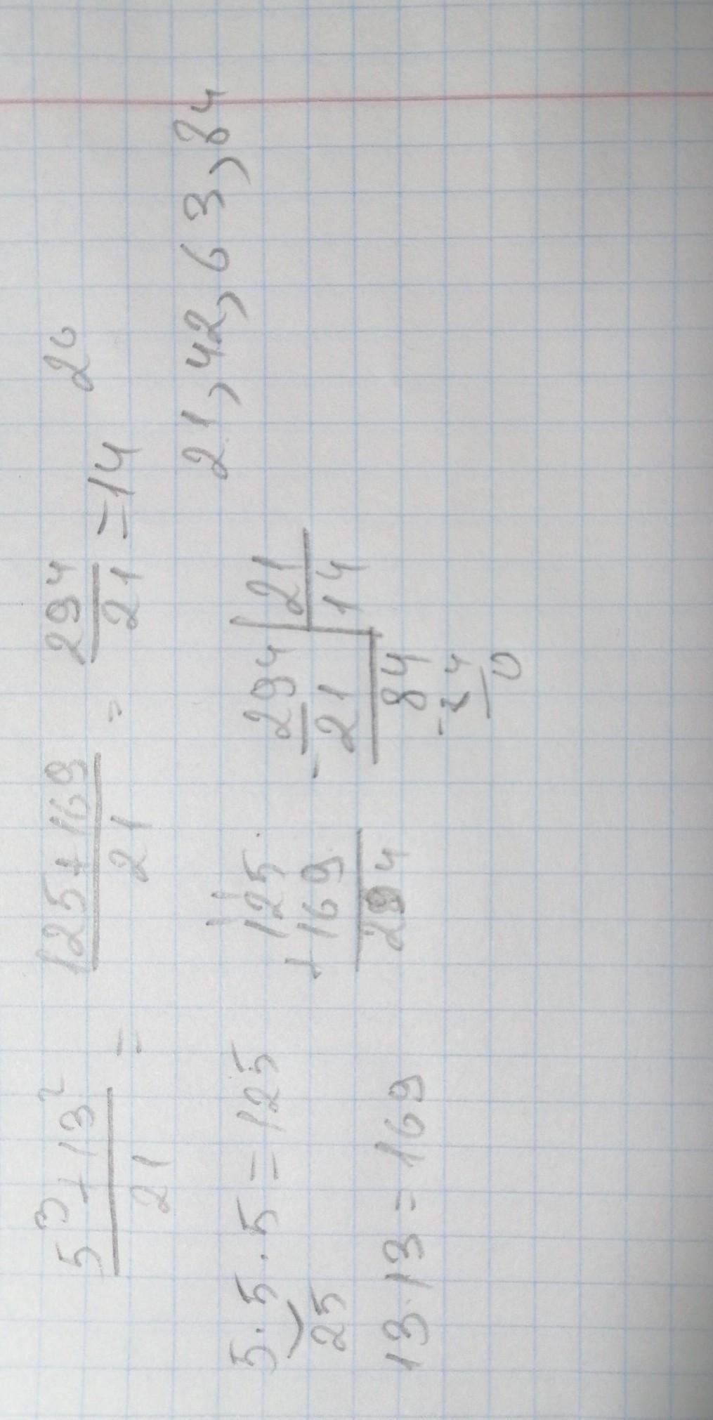 5 в кубе(5³) — это 5•5•5, то есть 125. 13 в квадрате(13²) — это 13•13, то есть 169. Таким образом мы получаем выражение (125+169):21