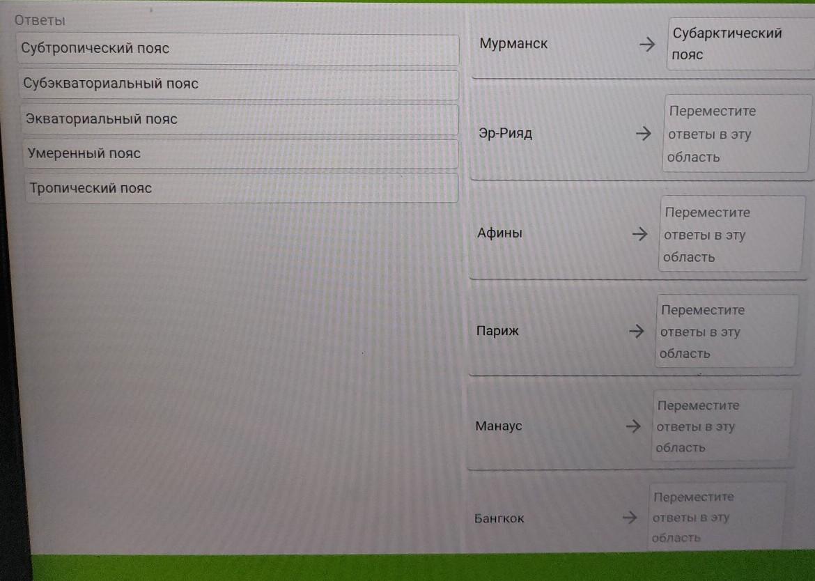 установите соответствия между городом и климатическим поясом в котором он расположен