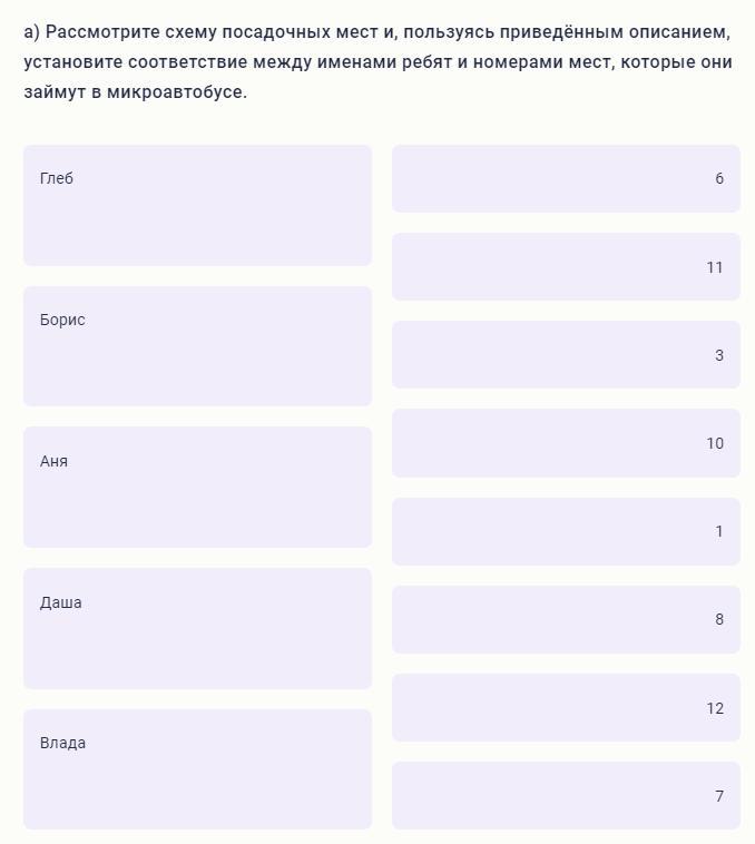 а) Рассмотрите схему посадочных мест и, пользуясь приведённым описанием, установите соответствие между именами ребят и номерами мест, которые они займут в микроавтобусе.