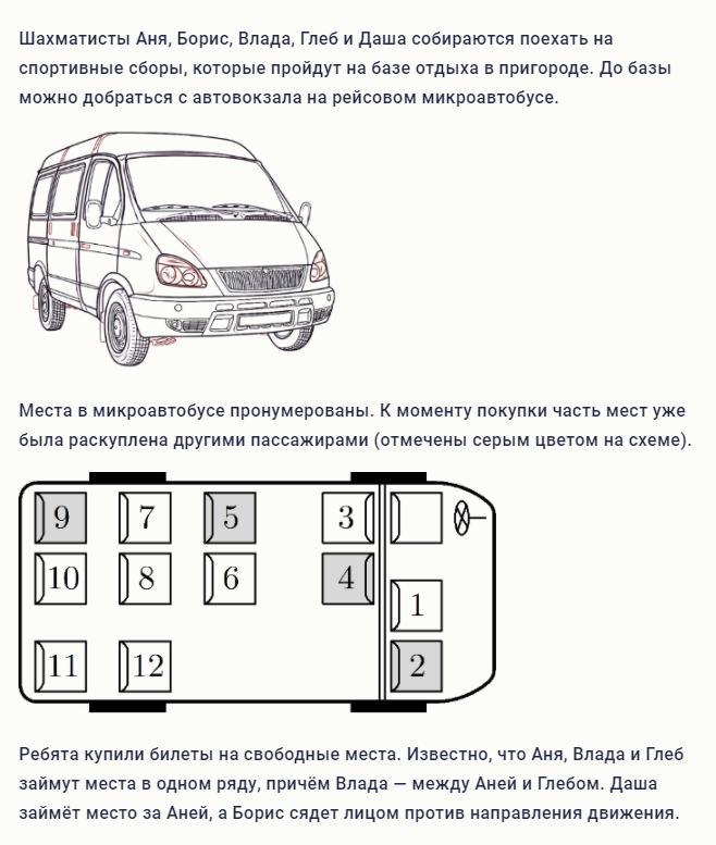 Шахматисты Аня, Борис, Влада, Глеб и Даша собираются поехать на спортивные сборы, которые пройдут на базе отдыха в пригороде. До базы можно добраться с автовокзала на рейсовом микроавтобусе.