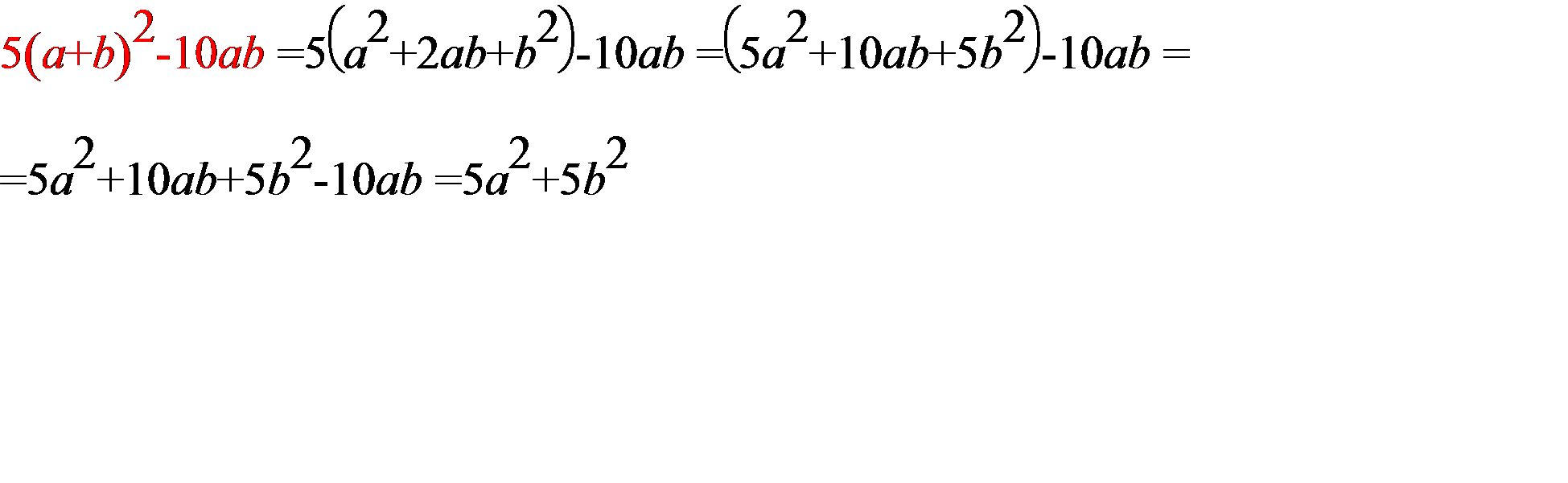 5(a^2 +2ab+b^2)-10ab=5((a^2 +2ab+b^2) -5ab=5(a^2 +b^2 -3ab)=5a^2 +5b^2 -15ab